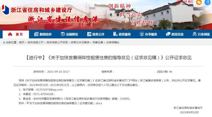9月10日,浙江省住房和城乡建设厅就《关于加快发展保障性租赁住房的指导意见(征求意见稿)》公开征求意见。