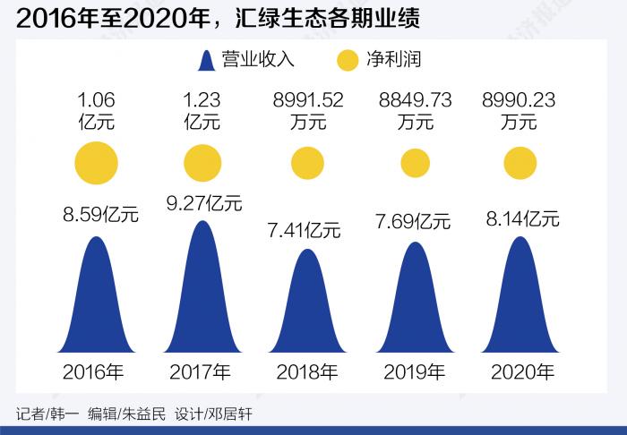 汇绿生态2018年至2020年业绩显示,公司营收分别为7.41亿元、7.69亿元、8.14亿元,净利润分别为8991.52万元、8849.73万元、8990.23万元。