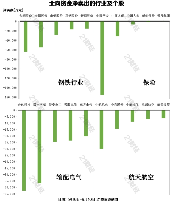 北向资金减持了20个行业,其中钢铁行业最多,净卖出金额达24.63亿元,其次是保险行业,净卖出19.30亿元。