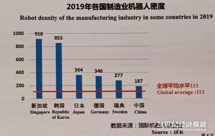辛国斌表示,全球工业机器人使用密度不断提升,工业机器人已成为智能工厂建设的重要组成部分。2019年全球制造业机器人密度平均为每万人113台,中国已由2016年的每万人71台增至2019年的每万人187台。