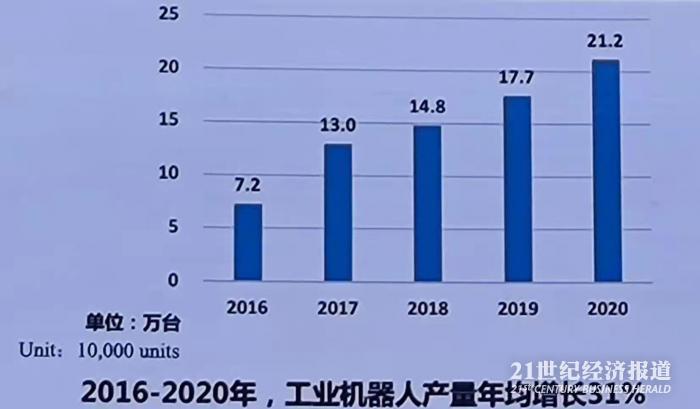 辛国斌介绍,目前中国工业机器人综合实力持续增强,产业规模快速增长,市场连续八年稳居全球第一,2020年装机量占全球的44%。2016-2020年,中国工业机器人产量从7.2万套快速增长到21.2万套,年均增长31%。