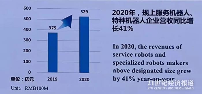 他介绍,2020年中国规模以上服务机器人、特种机器人制造企业营业收入529亿元,同比增长41%,随着医疗、养老、教育等行业智能化需求的持续释放,服务机器人、特种机器人蕴藏巨大的发展潜力。