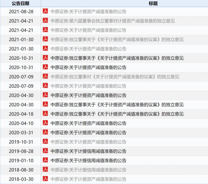 (图说:中原证券几乎每个季度都在披露计提相关减值准备)
