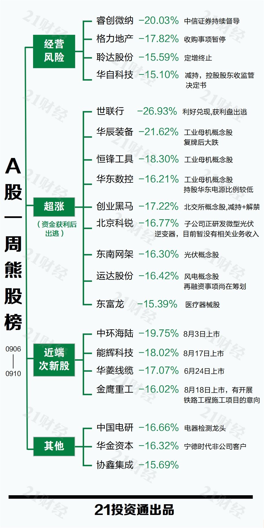 当周熊股榜,世联行(002285.SZ)、华辰装备(300809.SZ)、睿创微纳(688002.SH)位居前三,均跌超20%。前期飙涨的多只个股出现大幅回调,被打入熊股榜,包括上期最牛股创业黑马(300688.SZ)周跌17%。