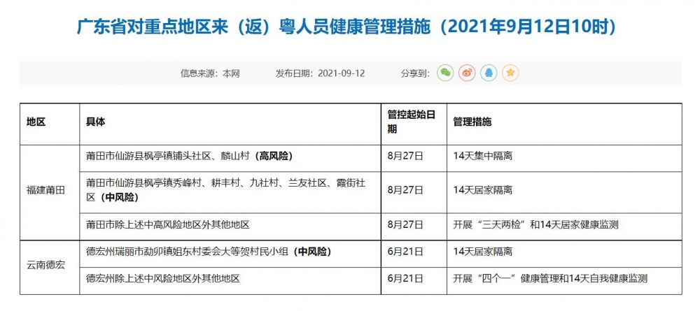 截至9月12日10时,广东仍对来自福建莆田、云南德宏两地重点地区来(返)粤人员采取相关健康管理措施,具体如下: