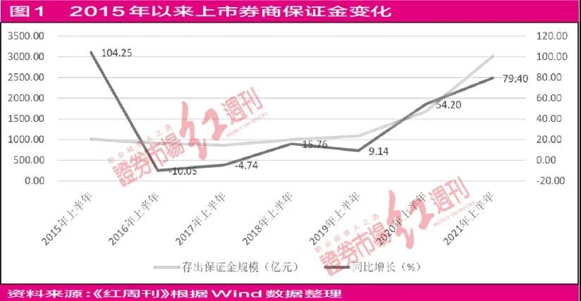 《红周刊》记者综合上市券商数据发现,券商保证金在今年上半年已经出现大幅增长的迹象,距离2015年牛市时的水平只有一步之遥(见图1)。数据显示,截至今年上半年末,上市券商保证金合计为3013亿元,而去年同期为1679.45亿元,今年上半年同比增长79.40%。其中,老牌券商中信证券的存出保证金规模最高为385.11亿元,增速为1240.06%。此外,在这之前并没有披露“存出保证金”项目的互联网券商龙头东方财富,今年上半年的存出保证金也有34.66亿元,在50家上市券商中排名第22位。