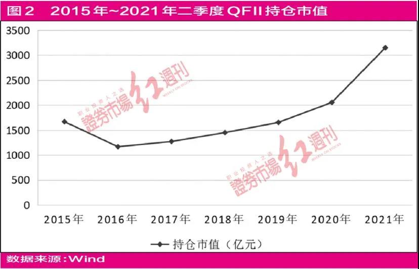 而在外资中,以北上资金为例,今年以来累计净流入A股2952.86亿元,同比增长167.46%,这已超过其去年全年的水平(2089.32亿元)。QFII也是如此,据《红周刊》记者统计,截至二季度末,QFII共出现在517家上市公司前十大流通股东名单,持仓总市值达3148亿元,创下历史新高(见图2)。而去年同期,QFII持仓总市值仅为2053亿元。据统计,北上资金和QFII的持仓合计占A股总市值(94.20万亿元)的3.07%,相比成熟市场10%及其以上的外资占比存在较大差距,差值为6.53万亿元。