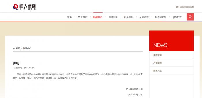 恒大集团:网络上近日出现的有关恒大破产重组的言论完全失实