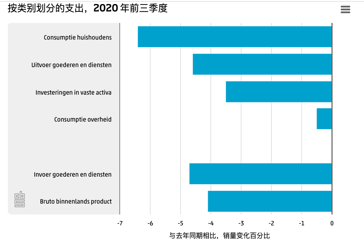 2020 年前三季度,GDP 较 2019年前三季度合计收缩4.1%。收缩的主要原因是家庭消费大幅下降(6.4%)。投资减少3.5% 也是原因之一。此外,出口下降了4.6%,但由于进口下降了 4.7%,贸易平衡保持良好。面对面公司的活动在第四季度受到自10 月 14 日以来的部分封锁 和自12 月 15 日以来的紧缩的阻碍。