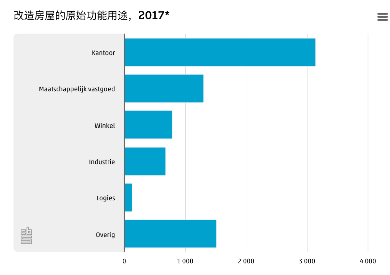 2017 年,通过办公室、商店或厂房等现有建筑物的改造,创造了 7,570 套住房。这些房屋是由 1,900 座建筑物改造而成的。绝大多数房屋(超过 40%)是在 2017 年通过改造办公楼建造的,17% 的房屋是社会房地产,例如学校、教堂或体育馆。2017 年增加到住房存量的房屋中有 8% 以上是改造的结果。