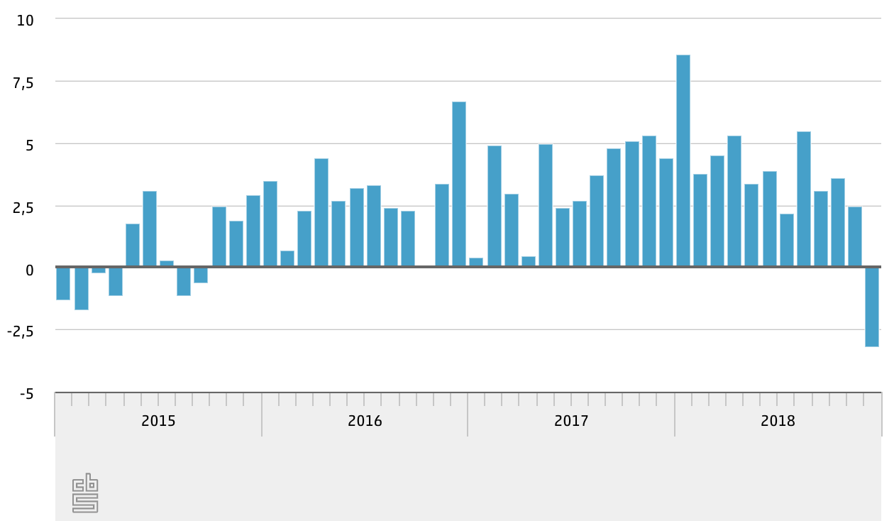 然而,2018 年 12 月,产量下降了 3.2%。2019 年 1 月,生产水平与一年前的生产水平基本持平。