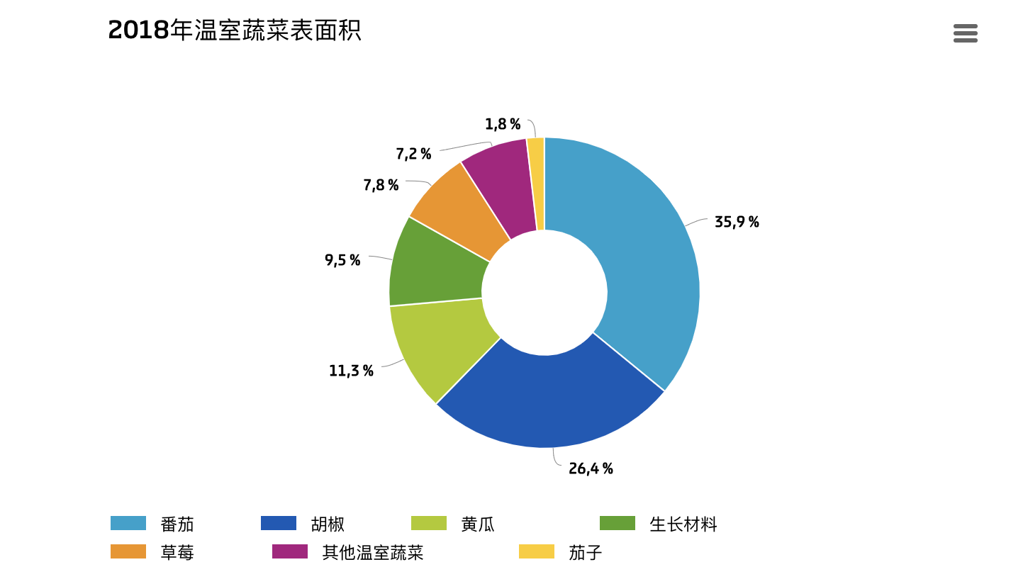 番茄是温室园艺中种植最广泛的蔬菜。2018 年,番茄种植面积占温室蔬菜总种植面积的三分之一以上(36%)。大约一半的番茄种植面积由藤蔓番茄组成。继西红柿之后最重要的温室蔬菜是甜椒(温室蔬菜面积的 26%)、黄瓜(11%)和草莓(8%)。温室蔬菜总面积多年来一直在4900公顷左右波动。