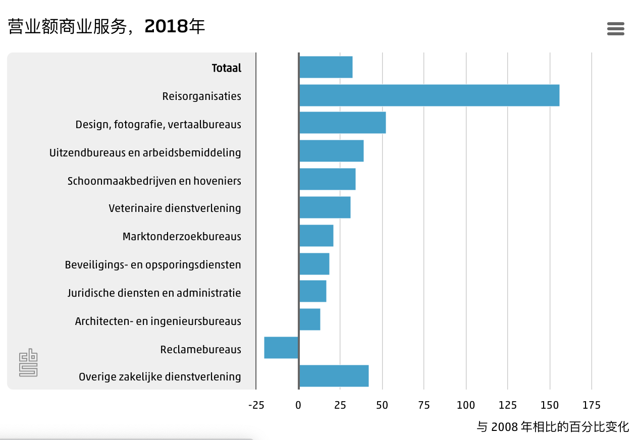 2018 年,商业服务提供商的营业额比十年前高出 33%。2009年和2010年,包括律师、建筑师、职业介绍所和旅游组织在内的商业服务提供者的营业额继续下降。从 2011 年开始,营业额逐年增加,在 2014-2018 年期间甚至平均增长 7%。