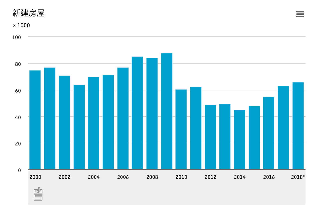 2018 年新建住宅近 6.6 万套,比 2017 年增加近 5%,是 2009 年之后的最高数字。2019 年 1 月 1 日,随着新建住宅的数量增加了 0.9%,达到超过 780 万套。从 2000 年到 2009 年,由于新建房屋,住房存量每年平均增长约 76,000 套。在 2014 年的最低点,这一数字已缩减至 45,000 套新建房屋。在接下来的三年里,新建房屋的数量增长得越来越快。2018 年的建造量比前一年多,但增长确实有所下降。