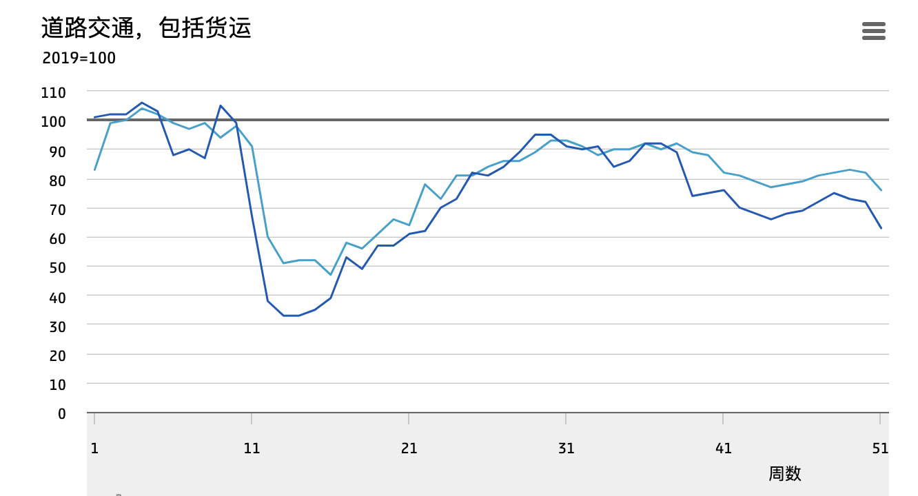 在新冠危机期间,道路交通量也有所减少。从 3 月中旬开始,道路交通(包括货运)降至 4 月初的最低水平。然后,当周的流量是 2019 年水平的一半左右,周末则是三分之一。此后,它在 7 月份反弹至略低于正常水平。9 月底,道路交通量与去年同期相比开始减少。直到第 51 周(包括第 51 周),工作日的流量平均 为 2019 年的82%。周末为76%,这几乎完全是由客运量减少造成的。货运量在 3 月至 6 月期间经历了极大的波动,有时比一年前还要繁忙。然而,从夏季开始,与 2019 年几乎没有什么不同。平均而言,截至第 51 周(包括第 51 周)的货运量与去年同期几乎持平,周末减少了近10%。