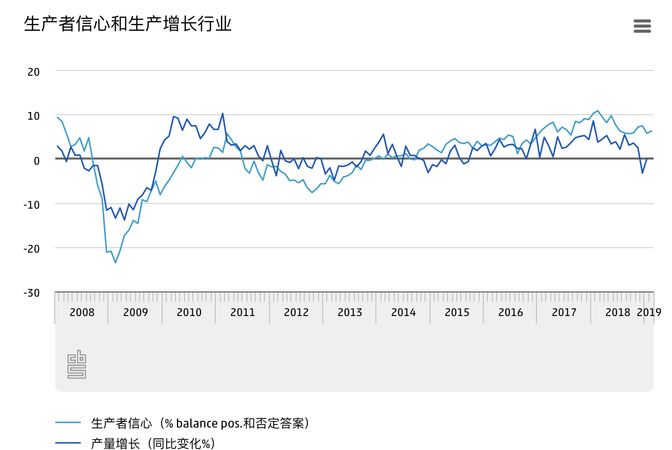 自 2014 年 10 月以来,积极进取的企业家占了上风。2019年2月制造业生产者信心小幅回升,由1月的5.8升至2019年2月的6.3,2018年2月工业企业信心创下10.9的历史新高。生产者信心与产量增长之间存在相关性。2015 年 10 月至 2018 年 11 月,日均产量与上年同期相比逐月增长。