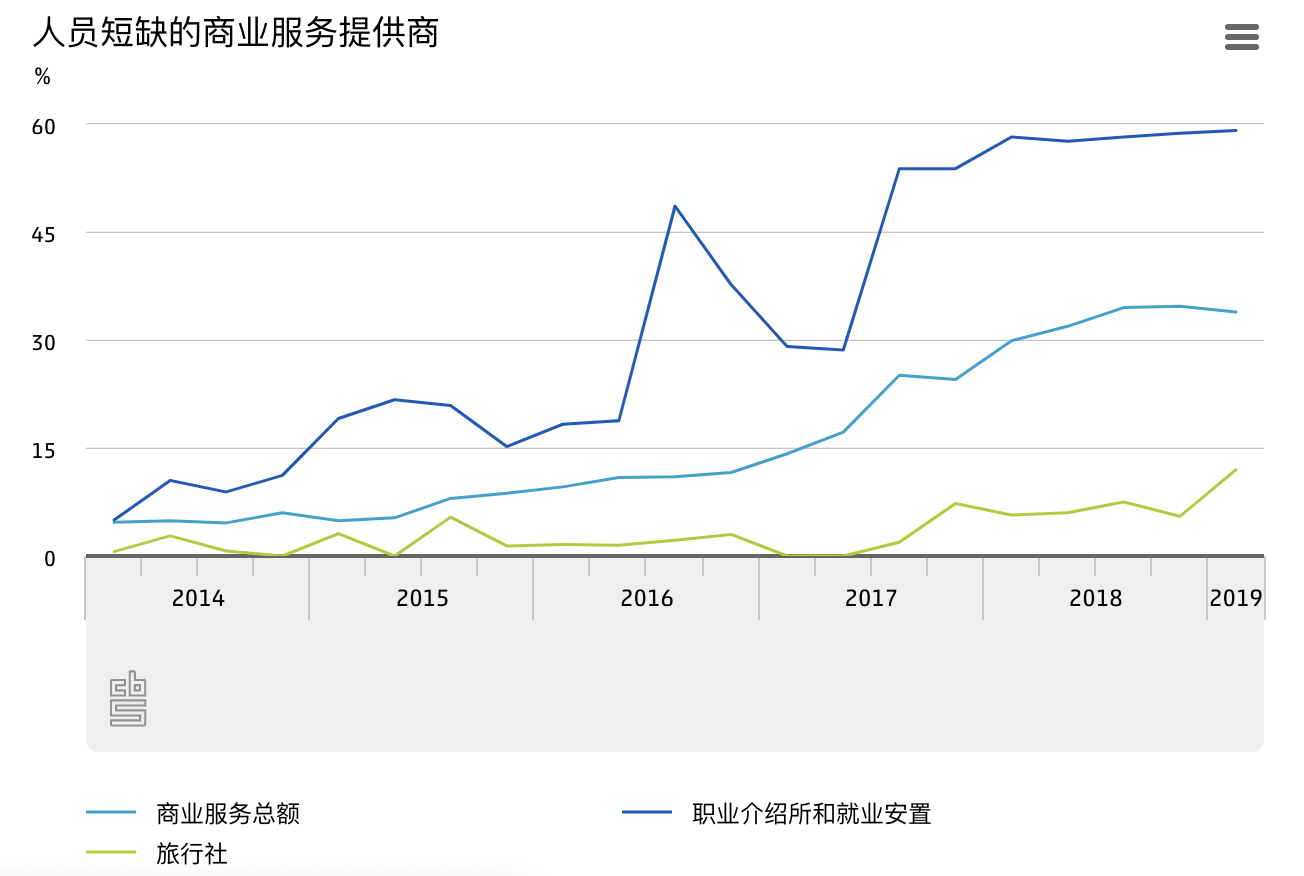 2019 年初,三分之一的商业服务提供商经历了劳动力短缺。五年前,每 20 家公司中就有 1 家报告员工短缺。在职业介绍所和职业中介机构中,出现人员短缺的公司比例最高,接近 60%。这在旅游组织中最低,为 12%。