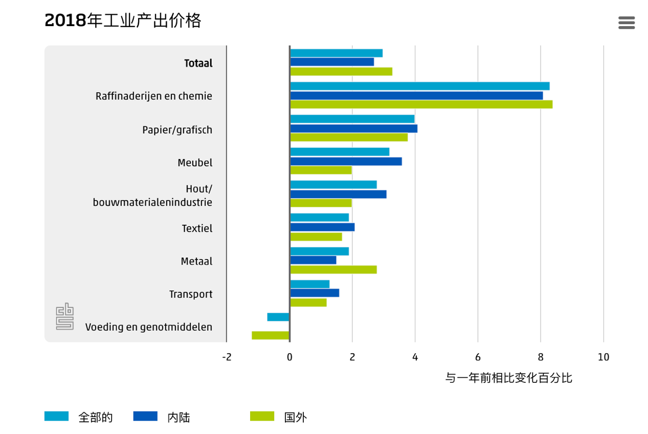 2018 年工业销售价格(3.0%)高于 2017 年。荷兰生产商向国内客户收取的价格和出口价格分别上涨了 2.7% 和 3.3%。炼油厂和化工公司在价格的积极发展中发挥了重要作用,价格比 2017 年高出 8.3%。