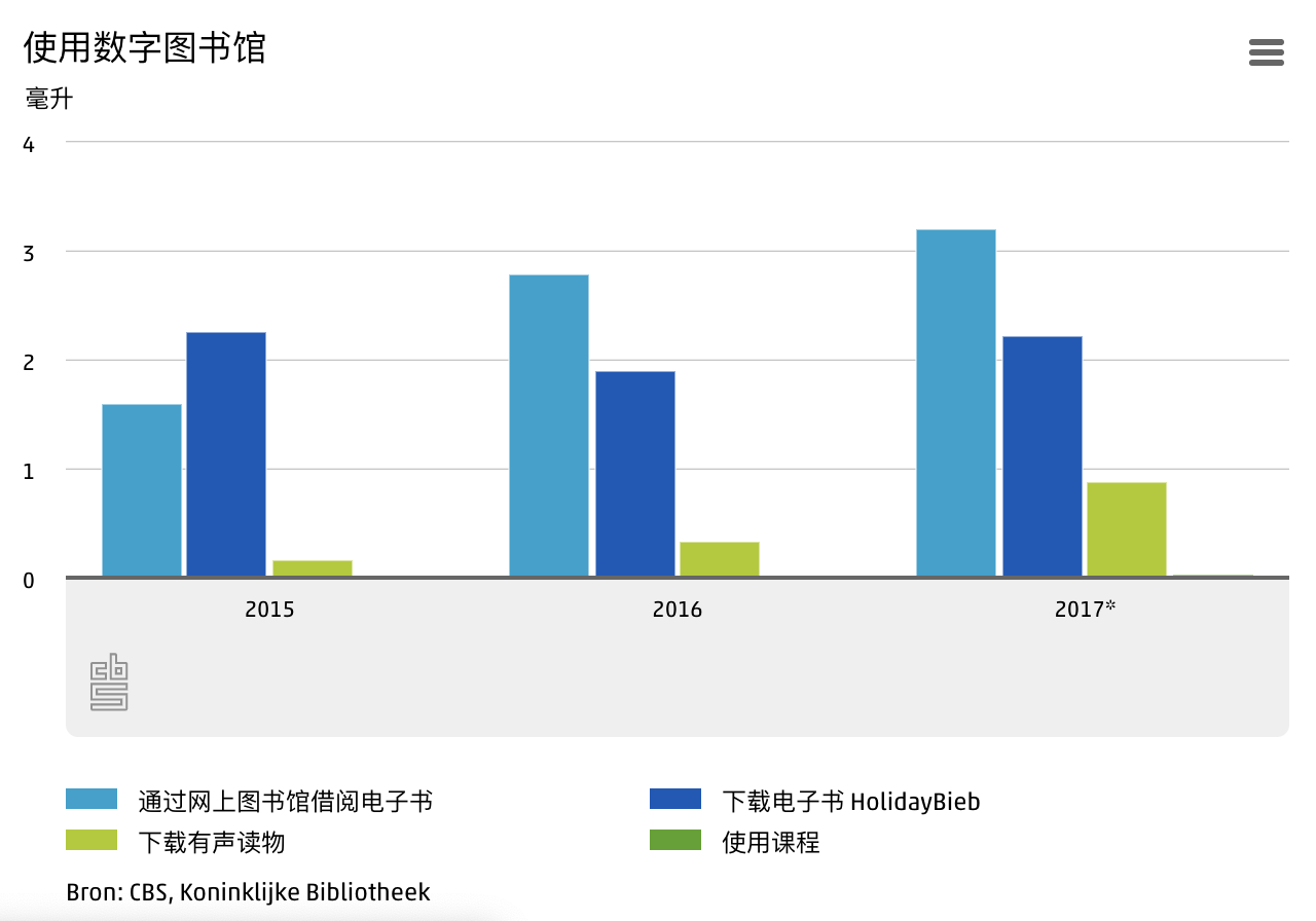 2017年,国家数字公共图书馆共借出数字产品640万件。这比 2015 年增加了 58%。外借电子书的数量在两年内增加了 41%,达到 540 万本。与此同时,活跃的数字用户帐户数量增长了 144%。与图书借出总数(7,050 万)相比,电子书借出的份额仍然不大。然而,这一比例每年都在增长:2015 年 5% 的出借图书是电子书,2017 年这一比例已经达到 7.6%。