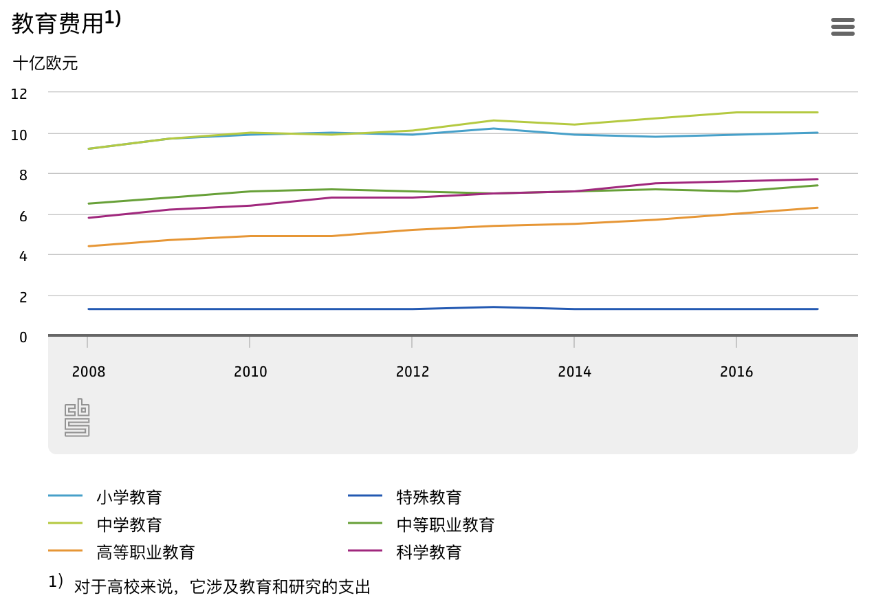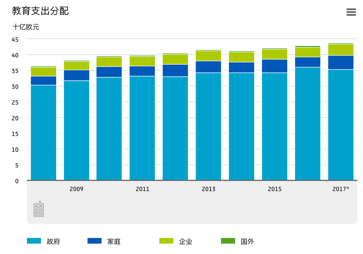 十年间,教育支出增长了 20%,达到 438 亿欧元。2017 年,政府占其中的 81%,即 353 亿欧元。这笔款项的大部分用于资助教育机构。家庭主要支付学杂费、书籍、教材、公共交通和补习。尤其是,公司在培训的实践部分为监督双重学徒和实习生而产生了成本。