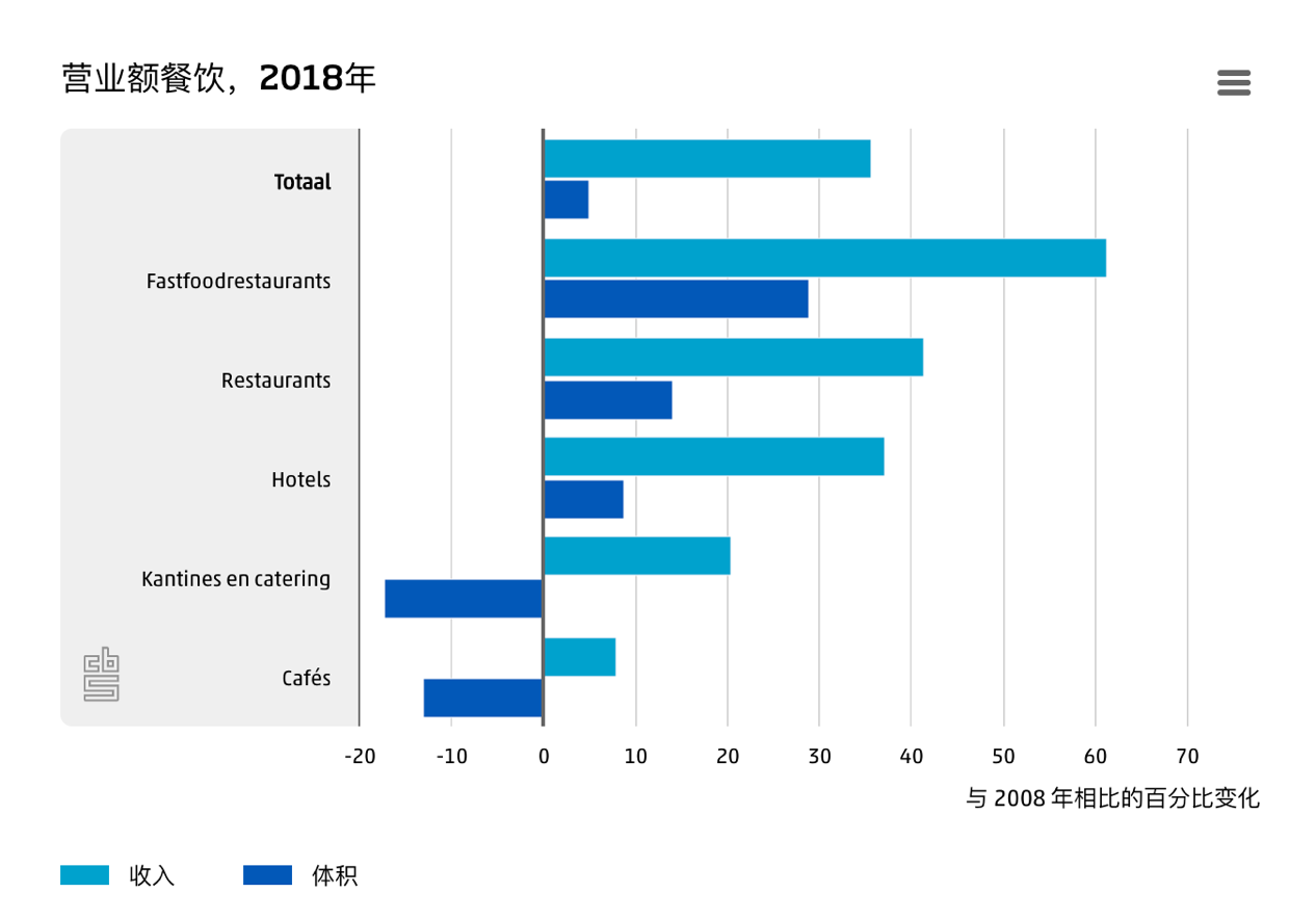 2008-2018年期间,餐饮业营业额增长了 36%。饮料和宵夜的数量比 2008 年增加了 5%。快餐店的营业额在此期间增长最多,超过 60%。咖啡馆、食堂和餐饮供应商售出的饮料较少。餐饮业营业额的发展主要是价格上涨的结果,销售额增长较少。