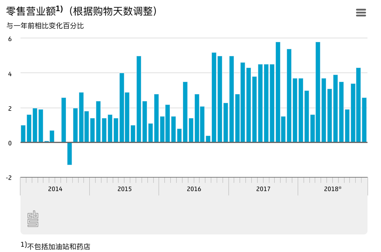 2018年零售业营业额增长3.4%。这是继 2007 年之后的第二高营业额增长率。2017 年营业额增长率为 4.2%。销售额增长了 2.9%。2018年食品和非食品商店的销售额均有所增长。在非食品领域,DIY、厨房和地板商店以及家具商店尤其受益于房地产市场的复苏。药店和服装店的营业额也高于2017年。