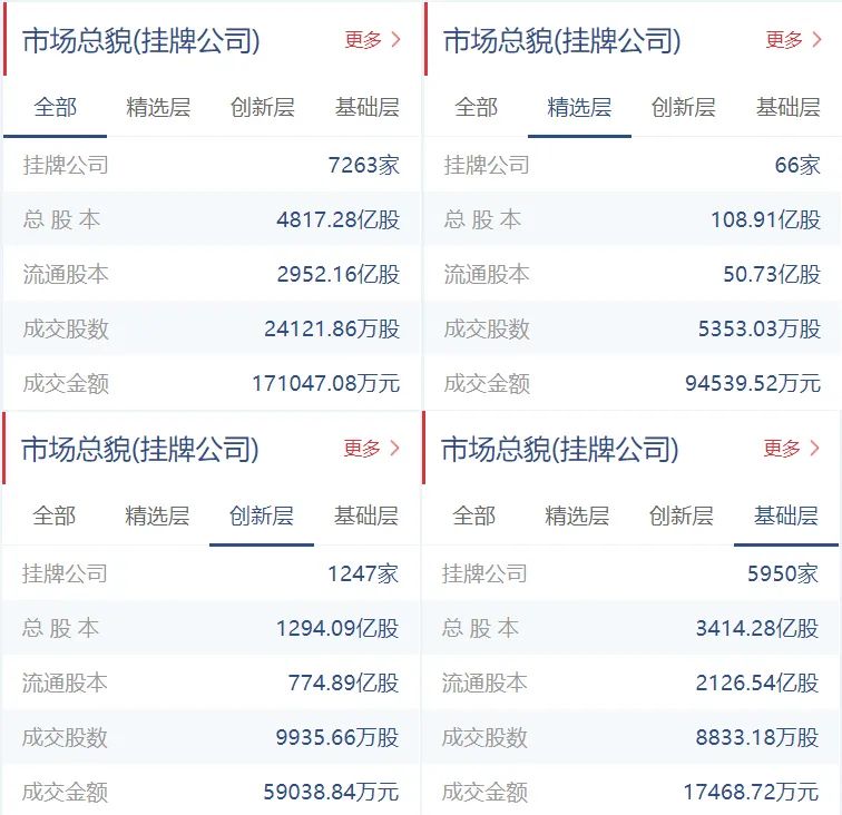 新三板挂牌公司总计7263家(精选层66家,创新层1247家,基础层5950家),总股本4817.28亿股,流通股本2952.16亿股。
