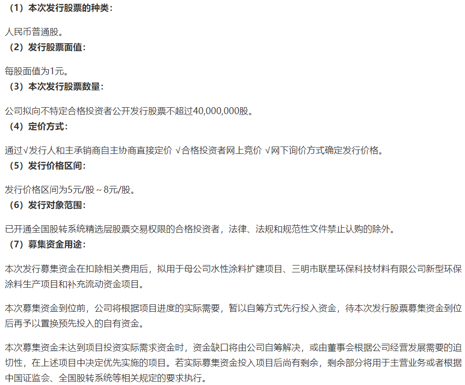 本次公开发行股票募集资金扣除发行费用后,惠尔明拟用于母公司水性涂料扩建项目、三明市联星环保科技材料有限公司新型环保涂料生产项目和补充流动资金项目。