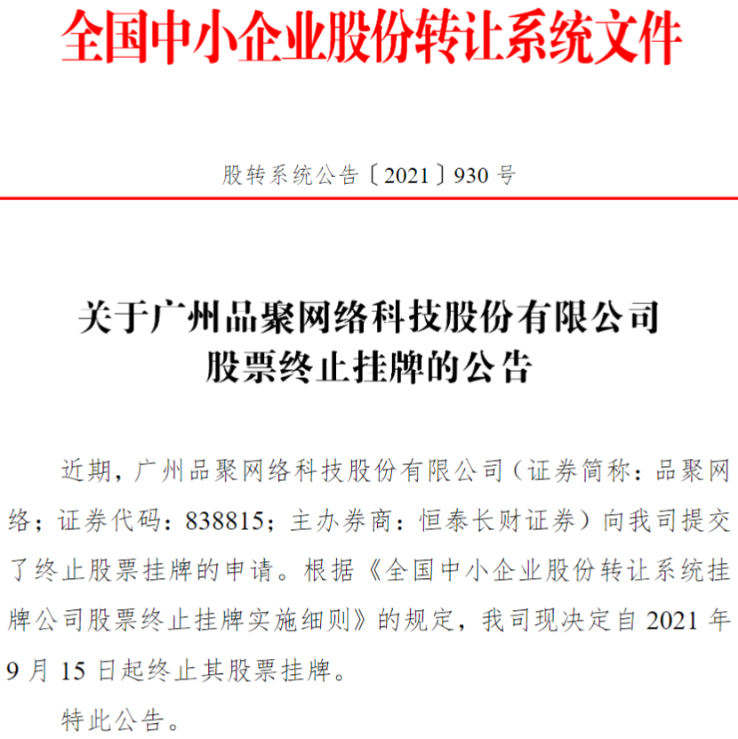 全国股转公告:近期,广州品聚网络科技股份有限公司向我司提交了终止股票挂牌的申请。根据《全国中小企业股份转让系统业务规则(试行)》的规定,我司现决定自2021年9月15日起终止其股票挂牌。特此公告。