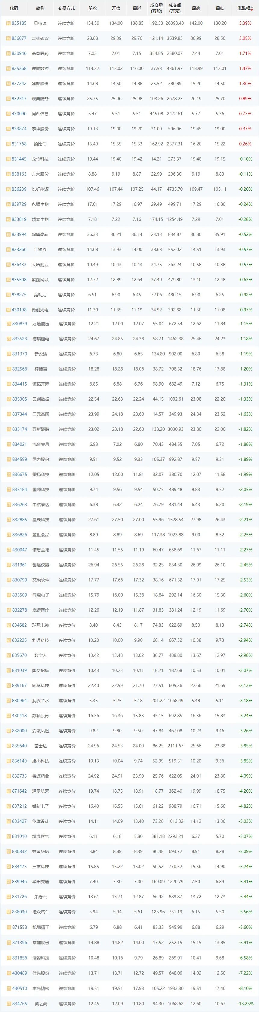截至9月14日收盘,今日成交金额为17.10亿元,精选层成交金额为9.45亿元,创新层成交金额为5.90亿元,基础层成交金额为1.75亿元;今日成交股数为24121.86万股,精选层成交股数为5353.03万股,创新层成交股数为9935.66万股,基础层成交股数为8833.18万股。