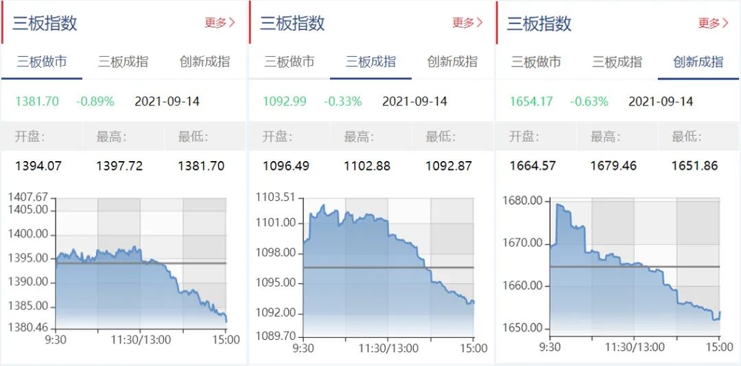 截至9月14日收盘,三板做市报1381.70点,下跌0.89%;三板成指报1092.99点,下跌0.33%;三板创新报1654.17点,下跌0.63%。
