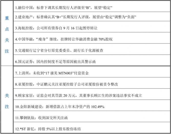 21世纪资管研究院研究员 万倩倩 实习生刘畅 9月15日,标普下调融信中国长期发行人评级至“B”,展望“稳定”;同日,标普确认建业地产“B+”长期发行人评级,展望由“稳定”调整为“负面”。近来因重破产重组频频进入公众视野的海航集团发布公告称,公司重整案第二次债权人会议将于9月29日召开。海航控股也发布公告称,公司所有债券自9月16日起暂停转让。中国华融“瘦身”继续,挂牌转让华融消费金融70%股权。