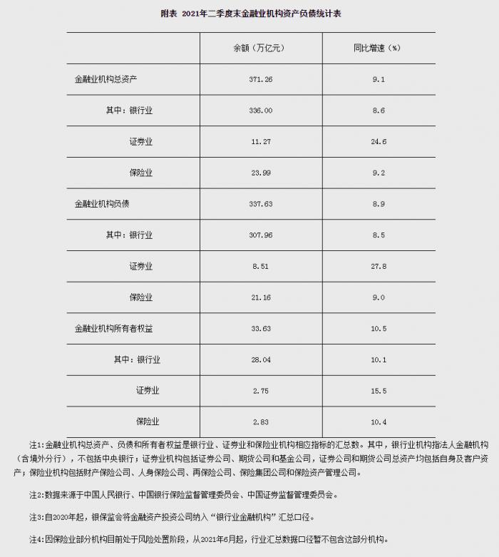 央行:2021年二季度末金融业机构总资产371.26万亿元
