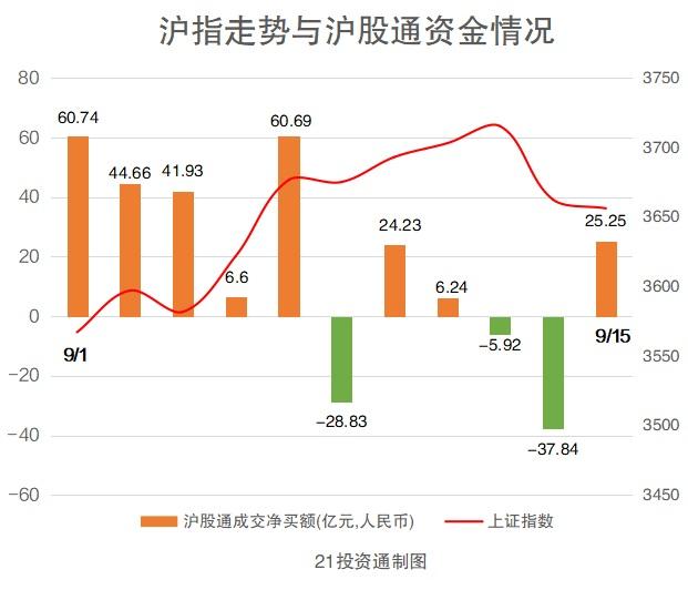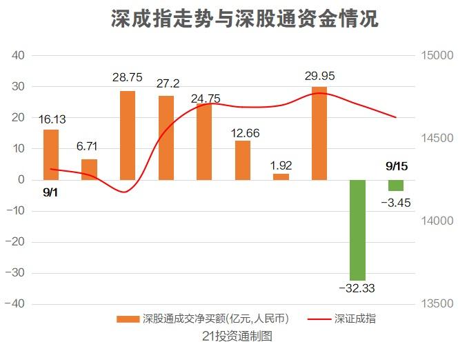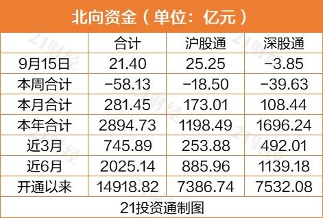 据21投资通(微信号ID:touzit21)智能监测,9月15日,北向资金重新回流,全天流入净额为21.4亿元,终结了此前连续两日净流出态势。其中,沪股通净买入25.25亿元,深股通净卖出3.85亿元,内部出现了明显的分化。深股通专用席位重点买入了风电概念股金风科技,买入净额达到1.2亿元