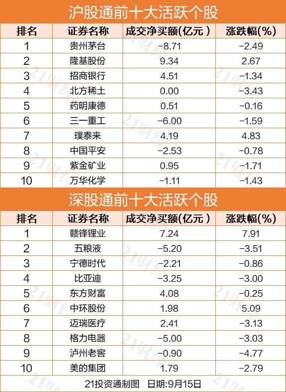 北向资金十大活跃个股方面,新能源产业链个股受宠,隆基股份、赣锋锂业、招商银行净买入额位列前三,分别获净买入9.34亿元、7.24亿元、4.51亿元。净卖出前三个股为贵州茅台、三一重工、五粮液,分别遭净卖出8.71亿元、6亿元、5.2亿元。