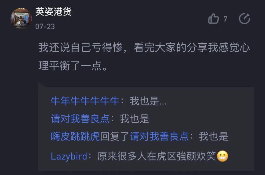 在港美股互联网券商老虎证券的社区里,“比惨大会”已经办到了第6届。用户们在评论区发帖晒单,放出惨不忍睹的收益图,在线比惨。