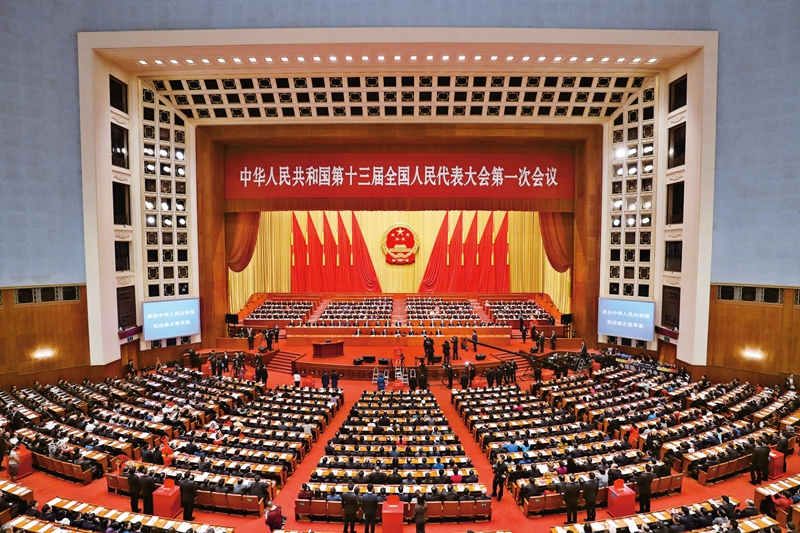 2018年3月11日,十三届全国人大一次会议在北京人民大会堂举行第三次全体会议,表决通过《中华人民共和国宪法修正案》。这次修改宪法,在宪法序言确定党的领导地位的基础上,将“中国共产党领导是中国特色社会主义最本质的特征”写入总纲。图为十三届全国人大一次会议第三次全体会议会场。新华社记者王晔/摄