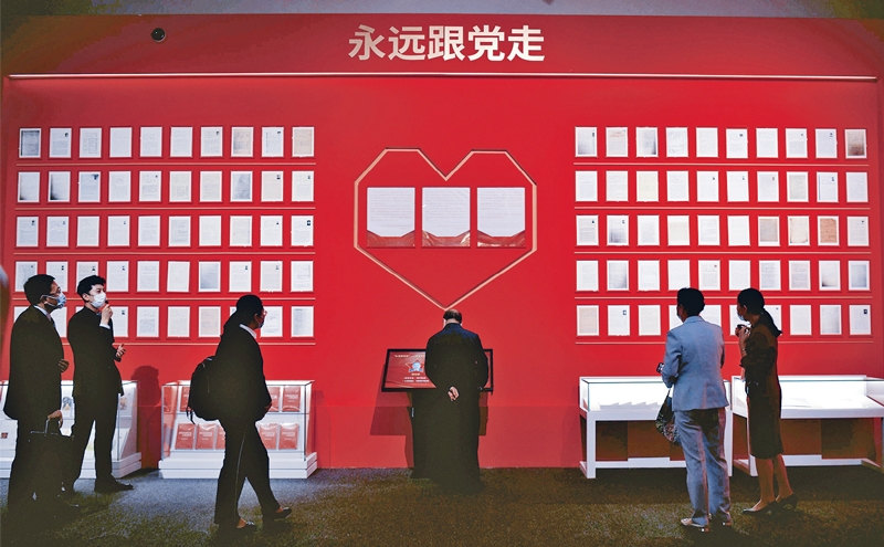 2021年5月24日,“众心向党 自立自强——党领导下的科学家”主题展在北京中国国家博物馆开幕。图为开幕当日,人们在观看钱学森等100位科学家的入党志愿书。新华社记者金良快/摄