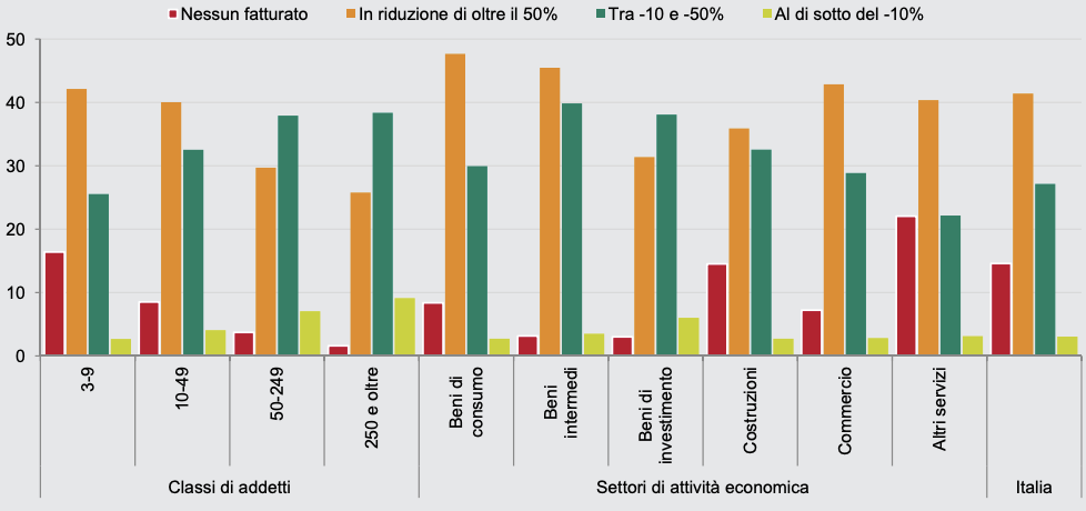 流行病控制措施导致生产系统的很大一部分经济活动大幅减少:超过70%的企业(代表几乎74%的就业)宣布减少,与上年同期相比,2020年3月至4月的营业额;以及在大约41%的案例中,下降幅度大于50%。此外,几乎15%的经营者的营业额为零:这一问题特别严重的情况涉及受危机后果影响最大的部门的一半以上企业健康危机:体育、娱乐和娱乐活动;旅行社经营者;住宿和餐饮服务。相反,大约5%的企业与一年前相比,营业额有所增加,在行业中的发生率更高是制药、化学和电信。