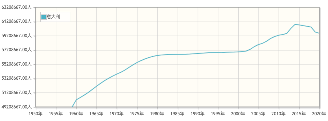 2019年意大利人口总数为6029.74万人,相比2018年减少了12.44万人;与2010年人口数据对比,意大利近十年人口增长了102.00万人。