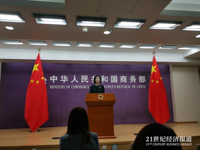 图:商务部新闻发言人束珏婷介绍我国汽车出口情况 21世纪经济报道 夏旭田 拍摄