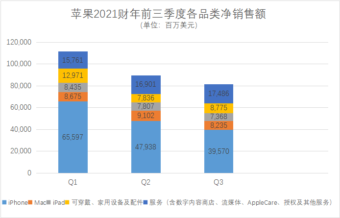 (陆玖财经根据苹果历年财报整理)然而,从2021财年的前三个季度财报来看,苹果的状况似乎却不太理想,Q1净销售额为 1,114 亿美元,季度每股摊薄收益为1.68美元;Q2净销售额为896亿美元,季度每股摊薄收益为1.40 美元;Q3净销售额为814亿美元,季度每股摊薄收益为1.30 美元。虽说比2020财年同期相比均有较大幅增长,但总体说来处于逐季度下滑的局面。唯一实现增长的还是来自于服务方面的收入。