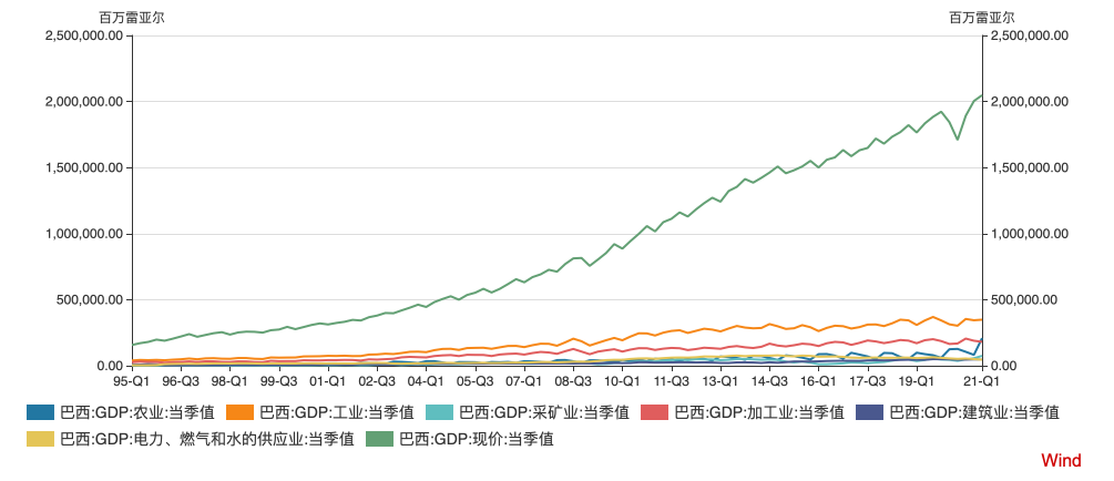 巴西2020年GDP下降4.1%。这是自1996年有记录以来的最差数值,此前记录的最大跌幅为2015年的-3.5%。其中2020年第四季度,GDP相较前三个季度上涨了3.2%。