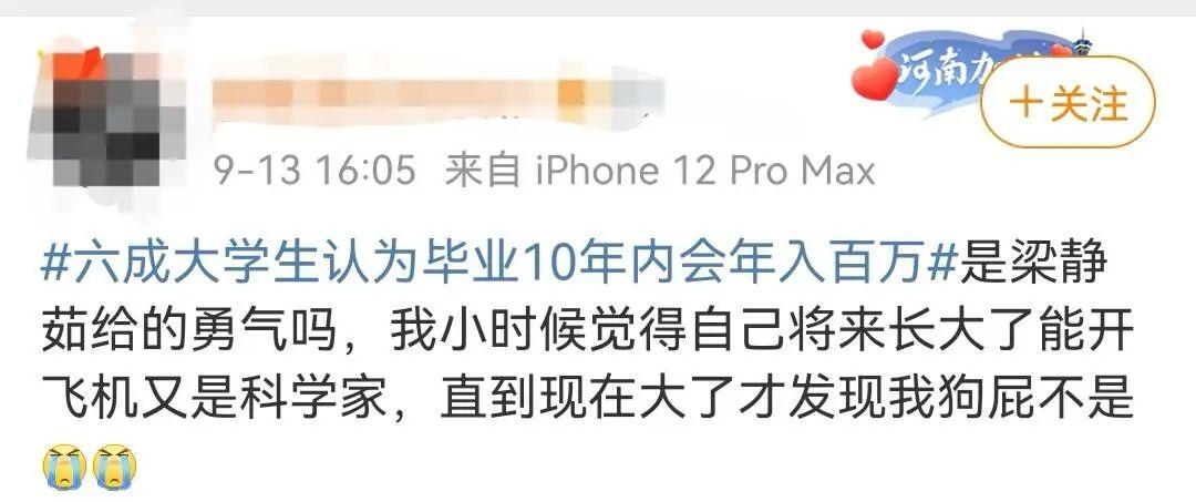 看到“六成大学生认为自己十年内能够实现年入百万”,我觉得年轻人有想法有冲劲挺好的,毕竟“求上得中求中得下“,即使受到社会毒打后没有成功可能会有些失望,但这也可以看作是走向成熟的过程。不过年轻人也不能把赚钱当作唯一目标,只要把每件事都做好,一定会“量变形成质变”,到最后赚钱就是理所应当的了。