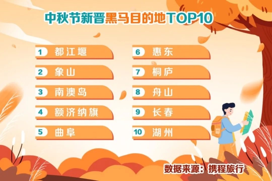 携程数据显示,中秋节新晋黑马目的地包括都江堰、象山、南澳岛、额济纳旗等。