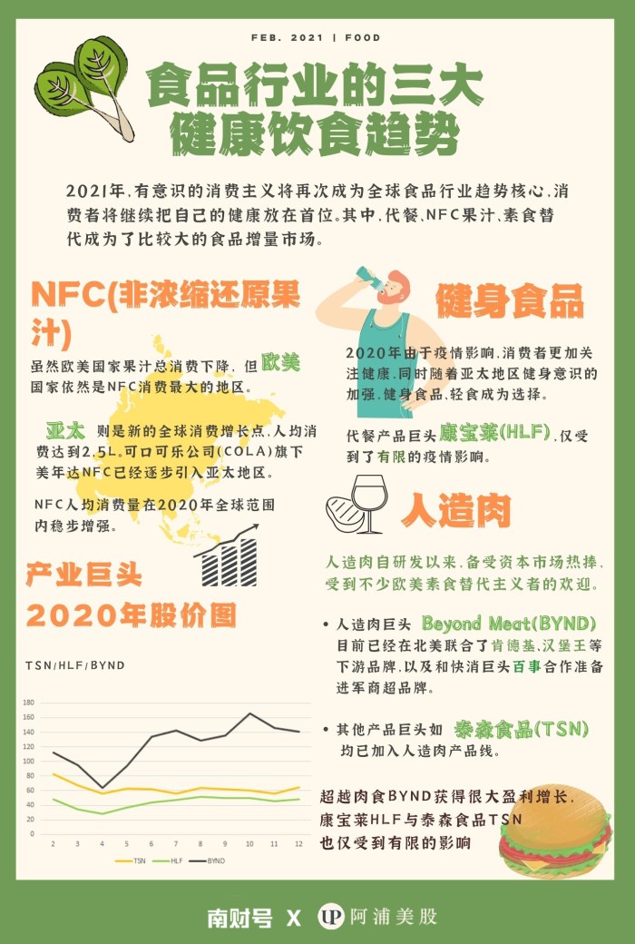 2021年,有意识的消费主义将再次成为全球食品行业趋势核心,消费者将继续把自己的健康放在首位。其中,代餐、NFC果汁、素食替代成为了比较大的食品增量市场。