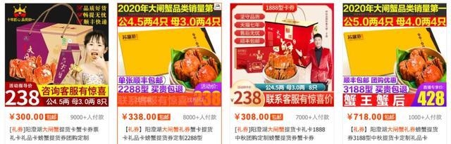 打开淘宝首页,以“大闸蟹礼券”为关键词搜索,月销10000+的店铺不在少数。有一家某明星代言的店铺,店铺粉丝数在11.9万,而销量前三的商品皆为不同规格的大闸蟹礼券,月销量分别为20万+、5万+和1万+。