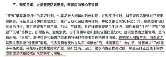 日前,中消协发布“双节”消费提示称,在购买大闸蟹方面,消费者尤其要注意防范“螃蟹券”套路。