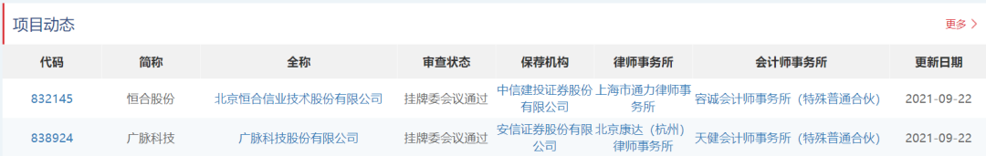 据9月18日召开的全国中小企业股份转让系统挂牌委员会2021年第19次审议会议显示,北京恒合信业技术股份有限公司、广脉科技股份有限公司均通过挂牌委会议。