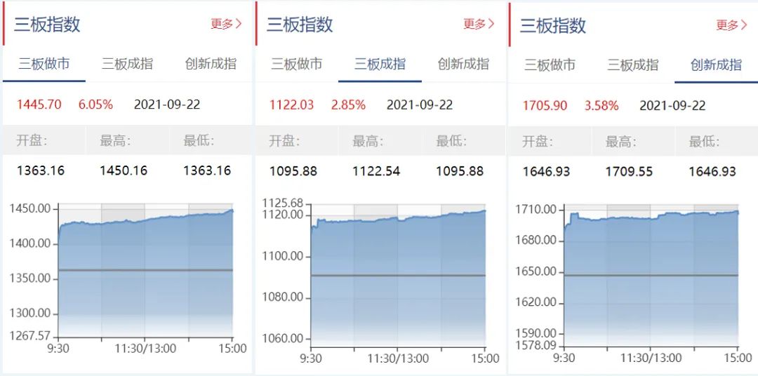 截至9月22日收盘,三板做市报1445.70点,上涨6.05%;三板成指报1122.03点,上涨2.85%;三板创新报1705.90点,上涨3.58%。